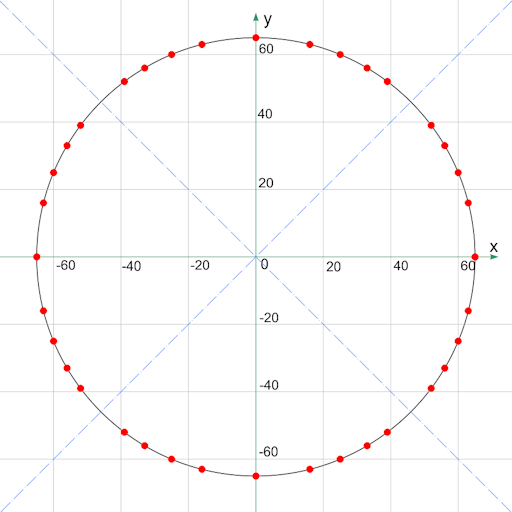 Dieser Kreis geht durch 36 Gitterpunkte. Drei davon sind primitive pythagoreische Tripel: (16, 63, 65), (33, 56, 65) und (39, 52, 65).