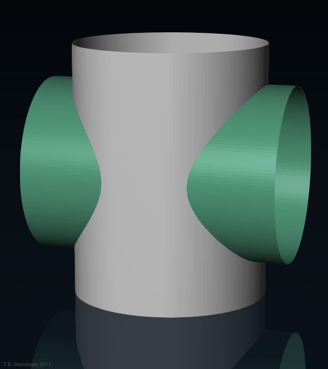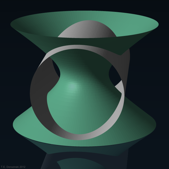 Die Durchdringungslinie ist also die gemeinsame Kurve für 4 Quadriken: einschaliges Hyperboloid, Kreiszylider, elliptische und hyperbelische Zylinder. Hier als o2c-Objekt.