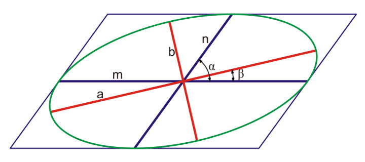 Wenn man die Achsen dieser Ellipse ermitteln will, kann man die Rytzsche Achsenkonstruktion anwenden.